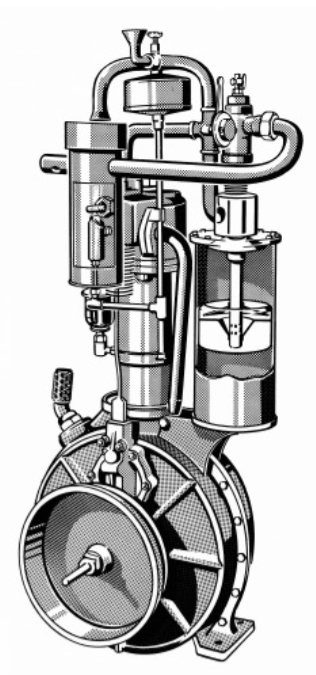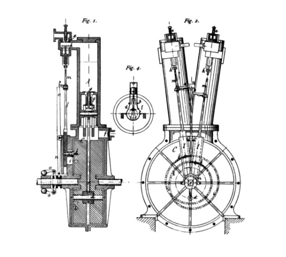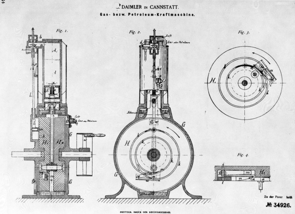 Surnommé « horloge du grand-père » en raison de sa forme, ce nouveau moteur, doté pour la première fois d’un carter fermé étanche à l’huile et à la poussière, est breveté par Daimler le 3 avril 1885 sous l’appellation de « moteur à gaz ou à pétrole ». Avec ce moteur mono cylindre, plus léger et à haut régime, capable de propulser divers véhicules sur terre et sur l’eau, Gottlieb Daimler transforme radicalement l’industrie des moteurs.