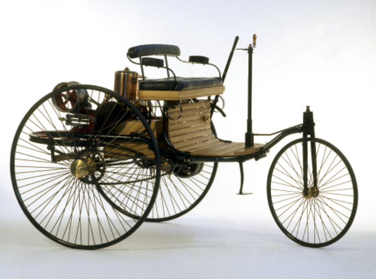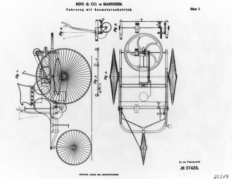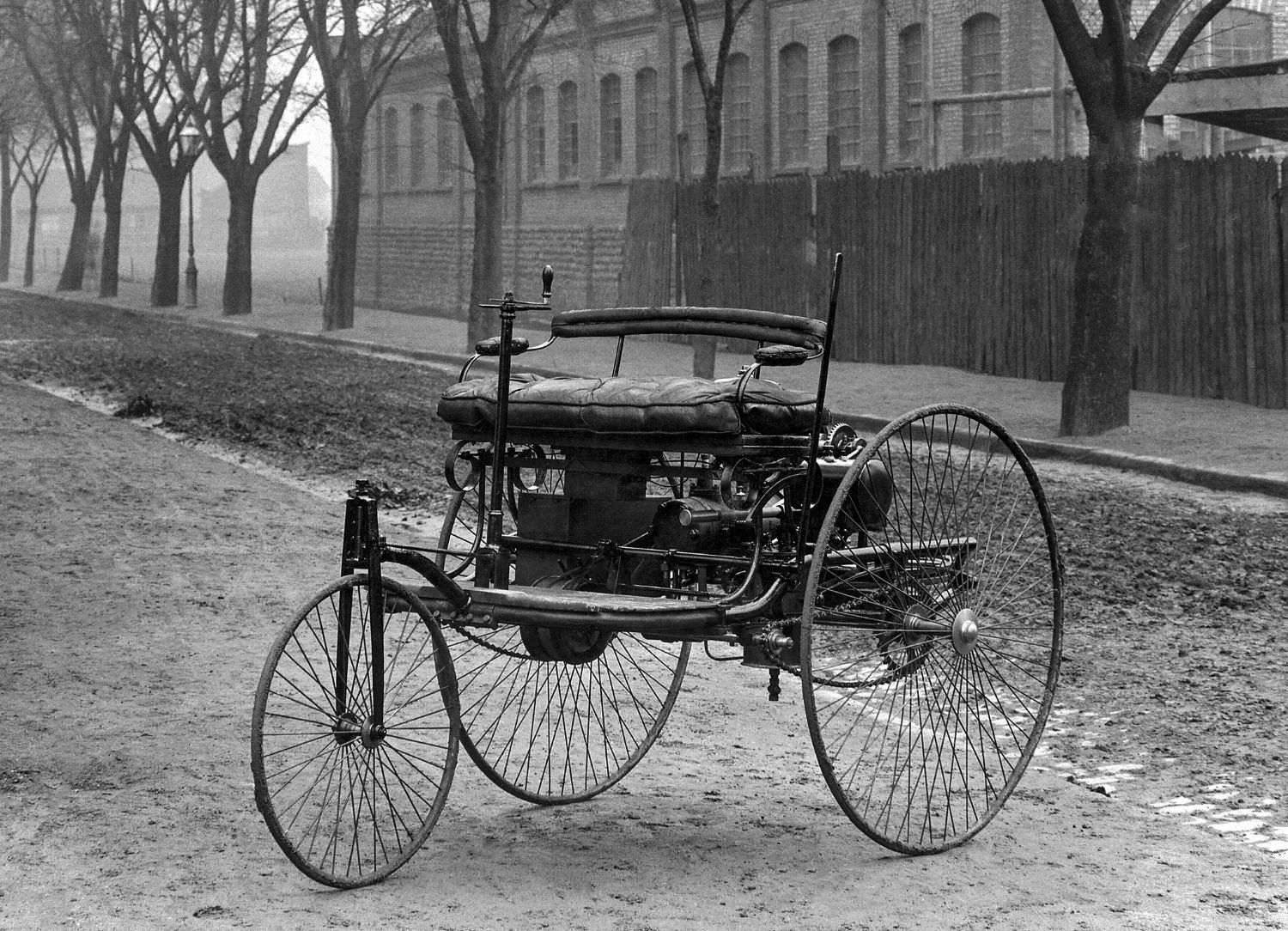Carl Benz se consacre alors à la conception de son premier véhicule automobile. Contrairement à ses contemporains, il ne se contente pas de modifier une calèche existante mais conçoit une véritable voiture, dont le moteur à combustion interne est l’élément central. C’est en 1885 que Benz présente la toute première voiture de l’histoire automobile : la Patent-Motorwagen. Ce véhicule à trois roues, équipé d’un moteur à combustion interne monocylindre de 954 cm3 développant 0,75 ch à 400 tr/min, atteint une vitesse maximale de 16 km/h. Avec un châssis dédié léger, un moteur à explosion à essence, un système de direction unique, un allumage, un refroidissement, une transmission, des roues et des freins, la Patent Motorwagen se démarque des autres prototypes de l’époque. Cette voiture à trois roues est brevetée le 29 janvier 1886.