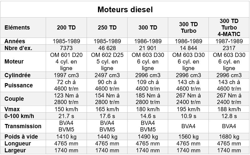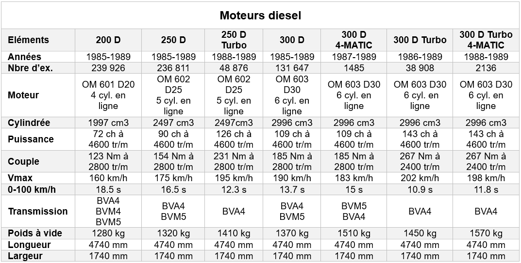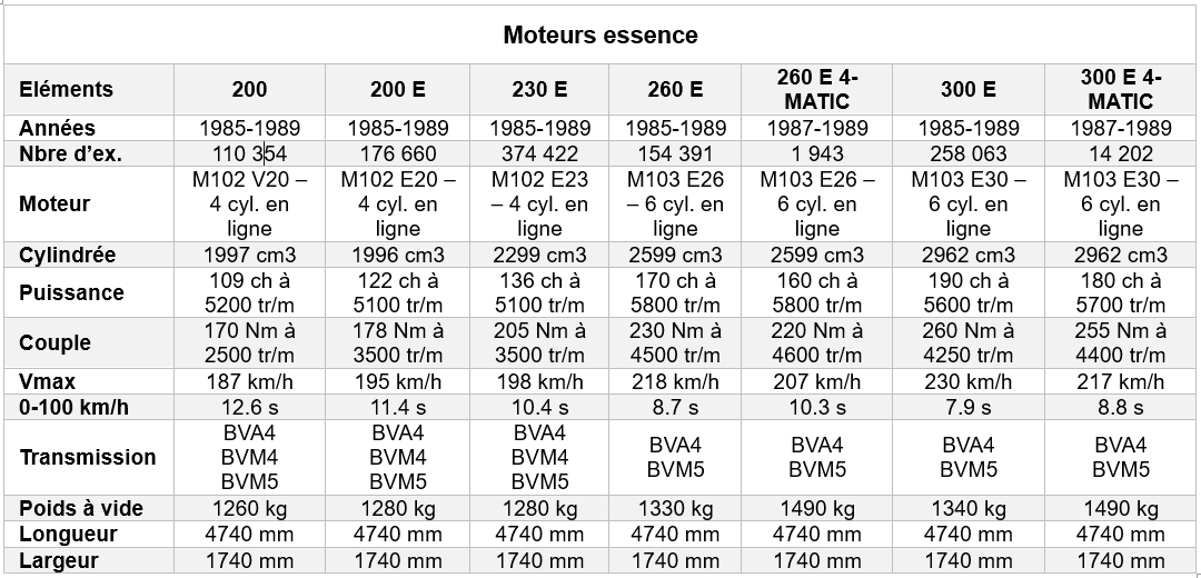 Caractéristiques techniques de la berline W124 (Diesel & Essence)