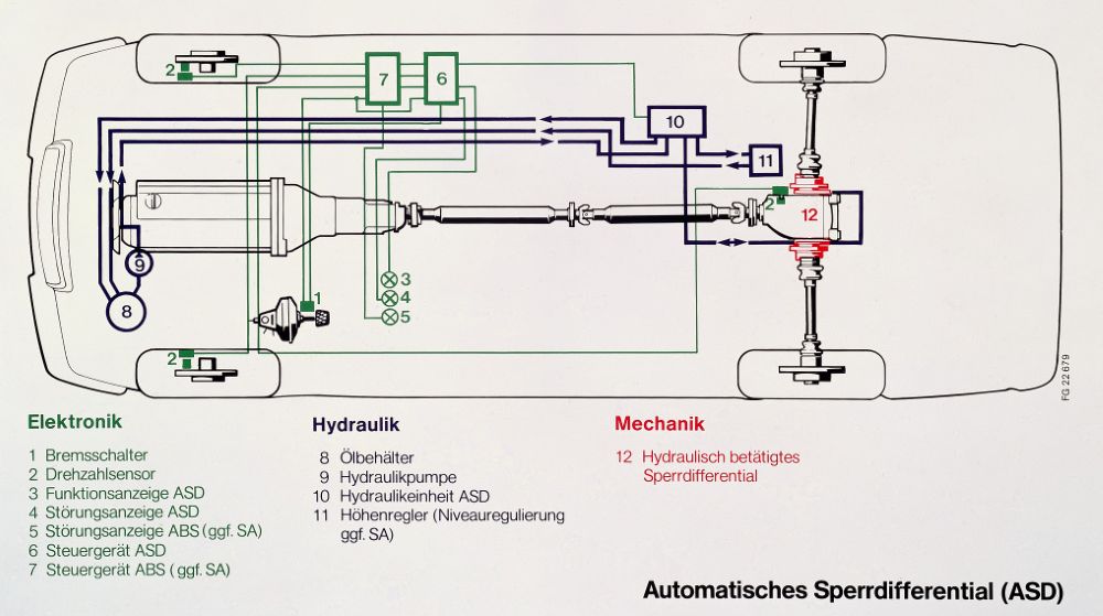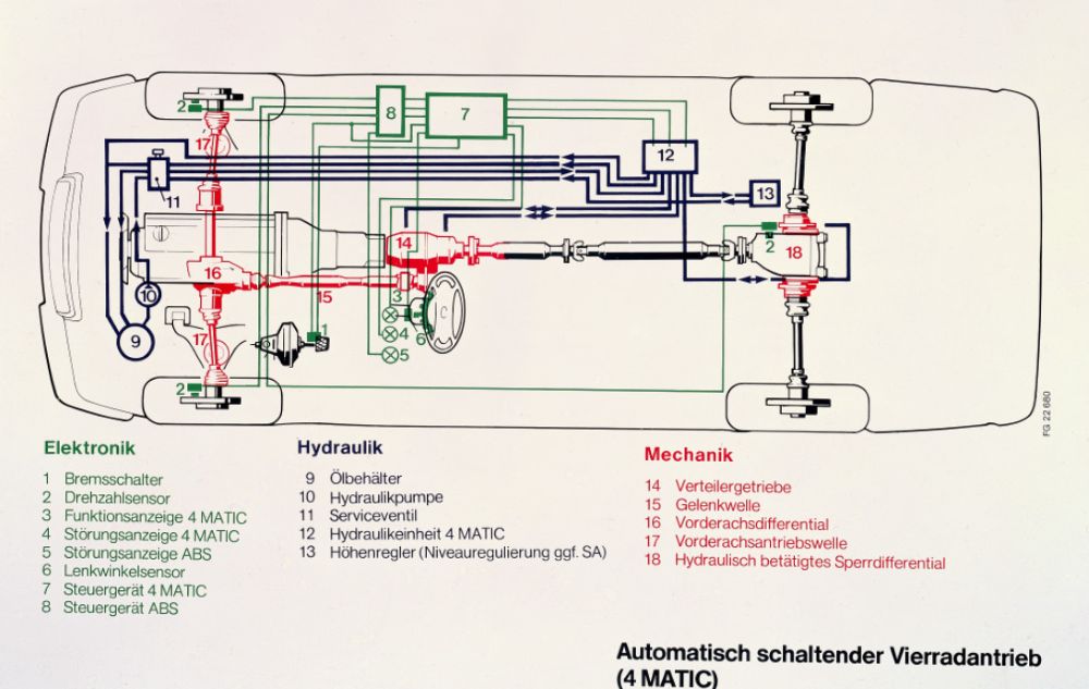 Mercedes-Benz introduit alors trois systèmes innovants : le différentiel autobloquant ASD, l’antipatinage ASR et la transmission intégrale 4MATIC. Le 4MATIC, disponible dès 1987 sur les berlines et les breaks à moteur 6 cylindres, est le plus onéreux. Ces technologies placent la marque à l’avant-garde de la sécurité active.