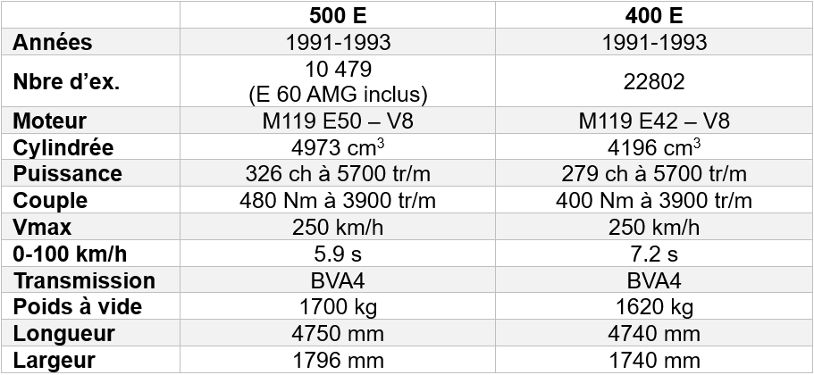 En septembre 1991, la 400 E fait son entrée, animée par le V8 de 4,2 litres issu de la Classe S. Moins spectaculaire que la 500 E mais affichant des performances très honorables, elle s’adresse à une clientèle exigeante recherchant une puissance plus discrète. Proposée à 50 000 marks de moins que sa prestigieuse aînée, elle séduit par son châssis retravaillé pour accueillir le V8 et par son freinage renforcé, qui en font une grande routière homogène.