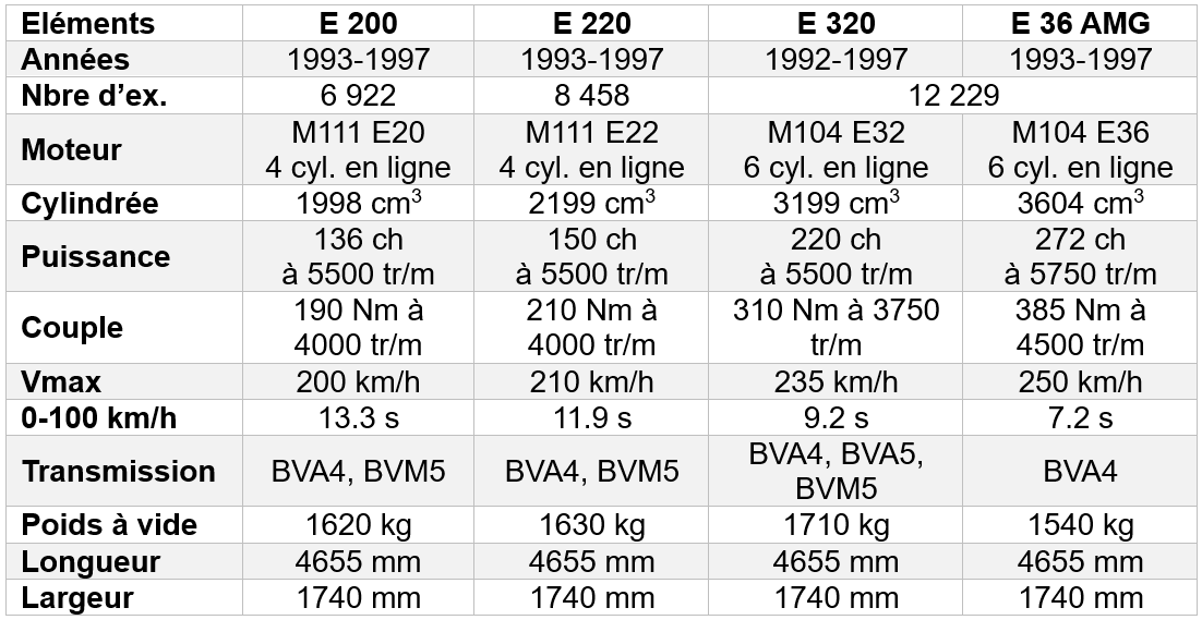 Jusqu’à l’arrêt de la production en 1997, 15 380 clients choisissent les versions quatre cylindres et 18 572 optent pour les six cylindres, ces derniers rencontrant un succès particulièrement marqué à l’export — notamment le E 320, dont environ 75 % des exemplaires prennent la direction de marchés étrangers.