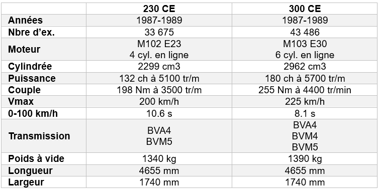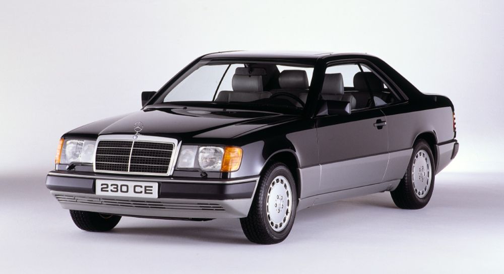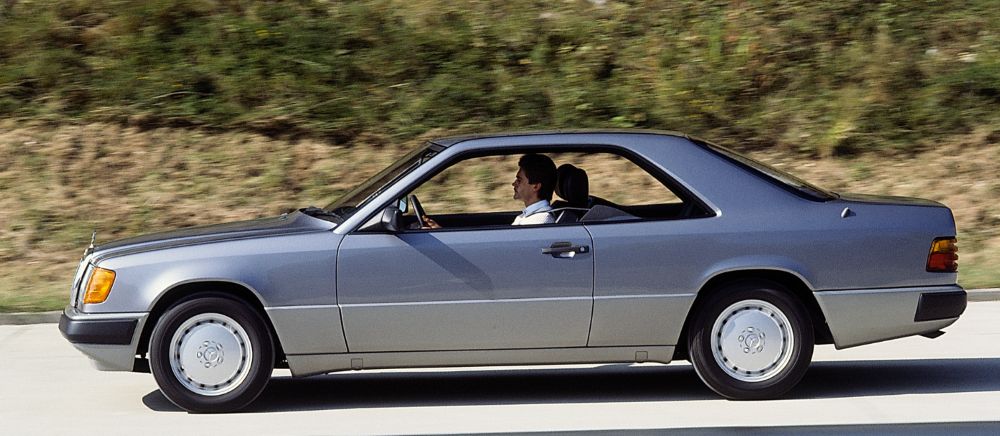 En mars 1987, Mercedes-Benz dévoile à Genève la version coupé, dix ans après le lancement du coupé W123. Plus court de 85 mm que la berline, il affiche une silhouette élégante et fluide, marquée par l’absence de montant central. La carrosserie adopte un design inédit, à l’exception de la face avant et des feux arrière repris de la berline. Il s’agit d’une grande routière élégante, et non d’une voiture de sport. Les coupés 230 CE et 300 CE offrent luxe, sobriété et le même niveau de sécurité que les berlines, tout en bénéficiant de motorisations éprouvées.