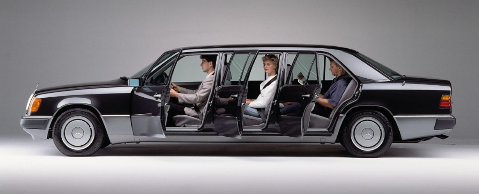 La gamme s’enrichit également d’une version longue à six portes, développée avec le carrossier Binz de Lorch et destinée aux hôtels, ambassades et administrations. Avec son empattement allongé de 80 centimètres, cette limousine prolonge la tradition Mercedes-Benz du sur-mesure dans une exécution digne de la Classe S. Trois motorisations sont proposées sur cette version à six portes : 250 D, 260 E et 280 E.