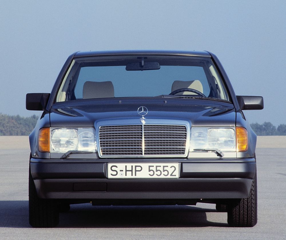La première génération de W124 se caractérise par ses blocs optiques avant rectangulaires. Les clignotants avant sont de teinte orange.