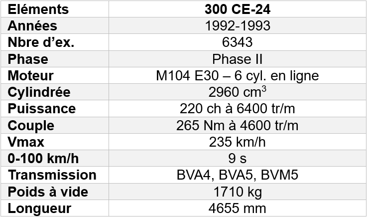 Avec ce cabriolet dérivé du coupé C124, Mercedes-Benz parvient à marier l’agrément du plein air avec les qualités intrinsèques de ses berlines : confort, sécurité et technologie de pointe. Présenté à l’origine sous le nom interne A124 et commercialisé au printemps 1992 sous l’appellation 300 CE-24, le modèle séduit immédiatement par son élégance et son équilibre stylistique. Il complète ainsi une famille déjà riche — berline, break, coupé et version longue — et s’impose rapidement comme un futur classique.