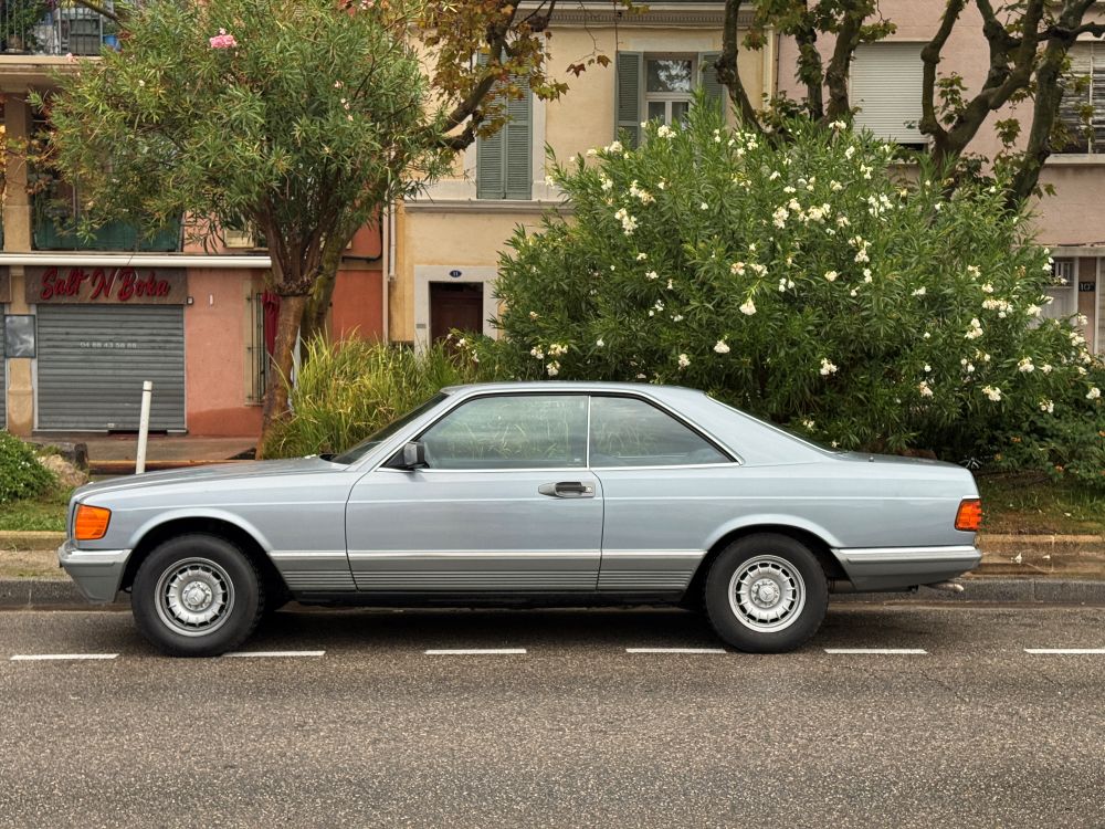 J’ai eu la chance de récupérer ce coupé Classe S 380 SEC grâce à un membre du Club Mercedes-Benz France. Avant moi, elle n’avait connu que deux propriétaires, dont le premier, un passionné très attaché à sa voiture, l’a entretenue avec un soin méticuleux pendant de longues années. Elle totalise aujourd’hui 153 000 kms. Peu de temps après l’avoir acquise, j’ai pris la route du sud de la France à son volant. Neuf heures de voyage avalées d’un trait, dans un confort inégalé. Cette voiture incarne tout ce qui fait le charme des grandes Mercedes-Benz des années 80 : une présence élégante, une mécanique noble et cette sensation unique d’être porté comme dans un nuage. C’est bien plus qu’une voiture : c’est une expérience de conduite, un art de voyager, une véritable passion étoilée 🙂 |